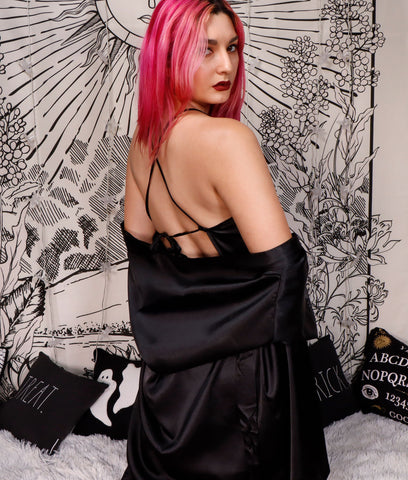 Go ahead and live in our Widow robe set. Satin fabric is soft to the touch. The robe is complete with an inner tie to hold the robe in place, and an outer tie is tacked on the back to avoid losing it. The slip is cheeky and fully adjustable with back ties.