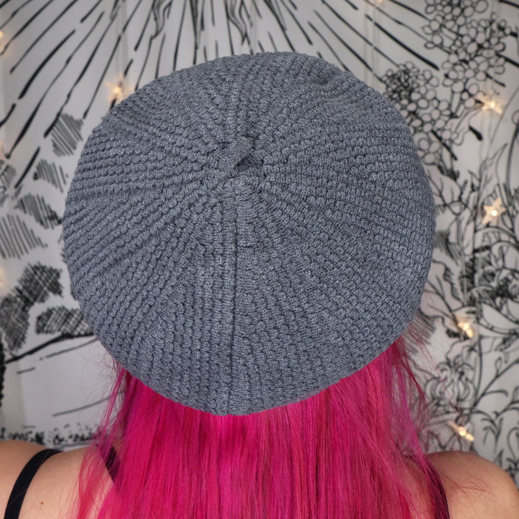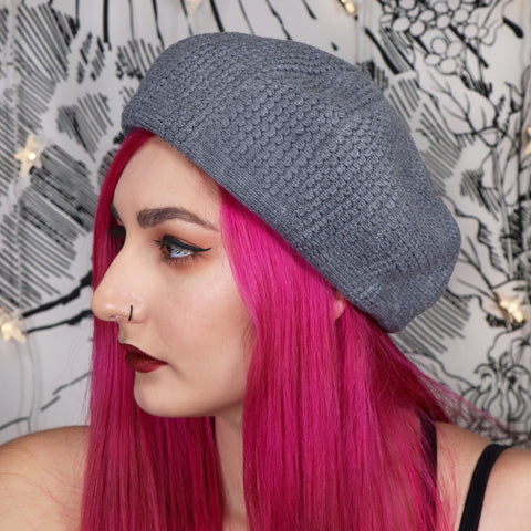 Stay warm in our newest adjustable knit beret. This classic heather grey beret has a scallop knits pattern and an adjustable inner tie to fit any head.