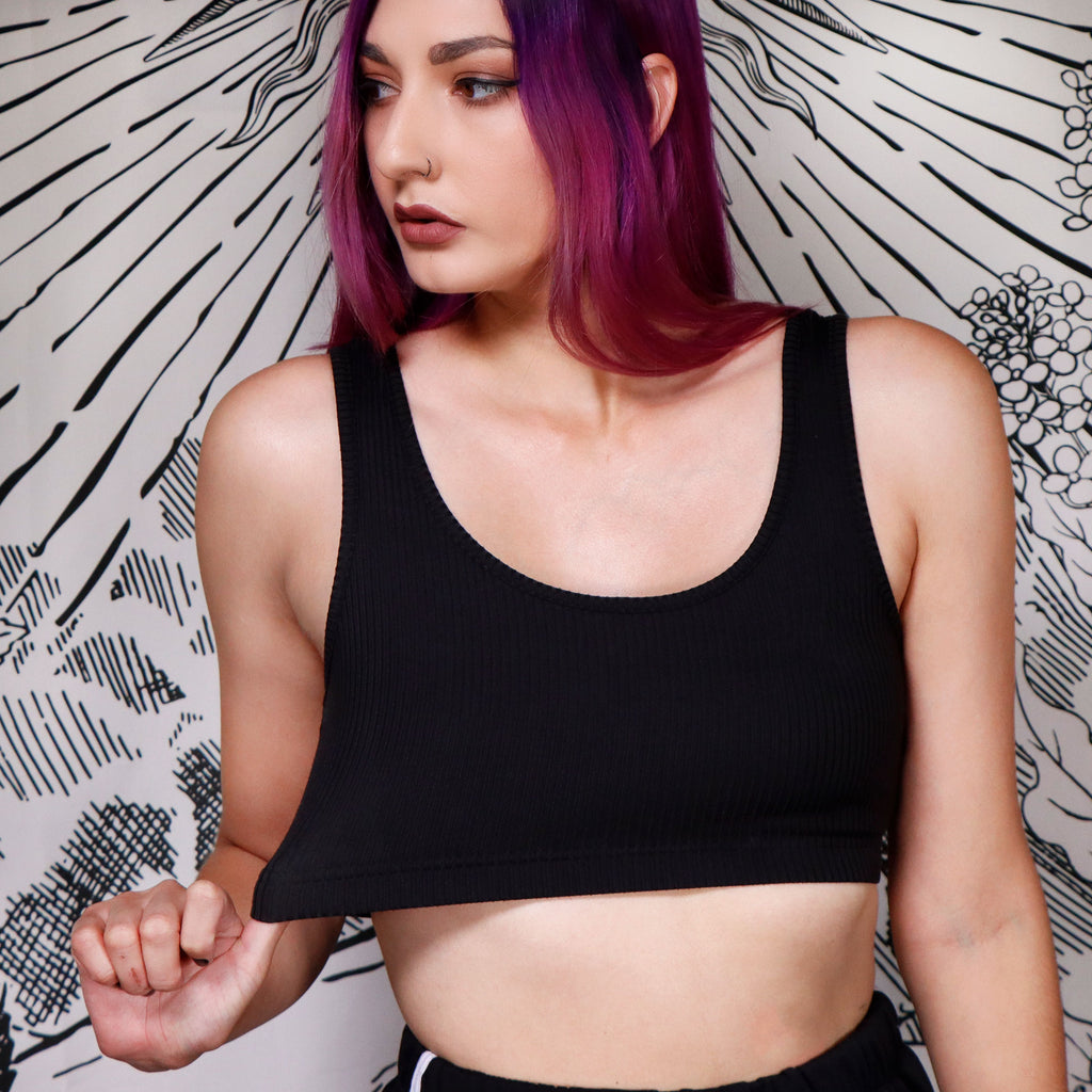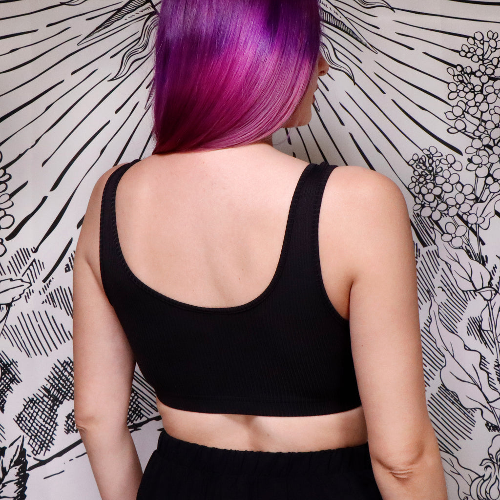 Treat yourself to some spooky comfort! New and improved bra tops have a double layer in the front for extra security and coverage! Our super-soft bra top is made out of our favorite super stretch rib knit and has an elasticated waistband to hold everything down! It is stretchy enough to be comfy to be worn all day, and night, and the next day after that. No underwire, no hardware, no problem. Turns out there IS rest for the wicked. Push that snooze button a few more times and dream on within comfort.